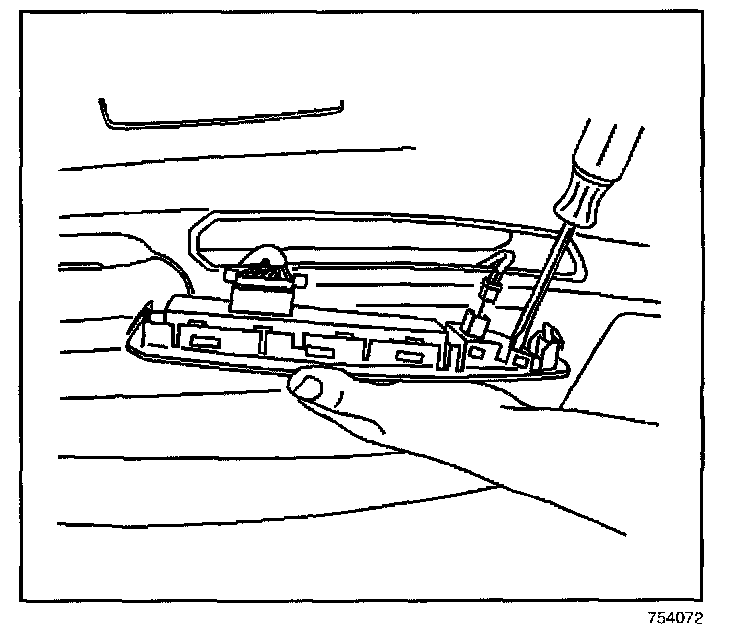 1. Insert a flat - bladed tool under the front edge of the switch to release the retainer from the door trim panel.