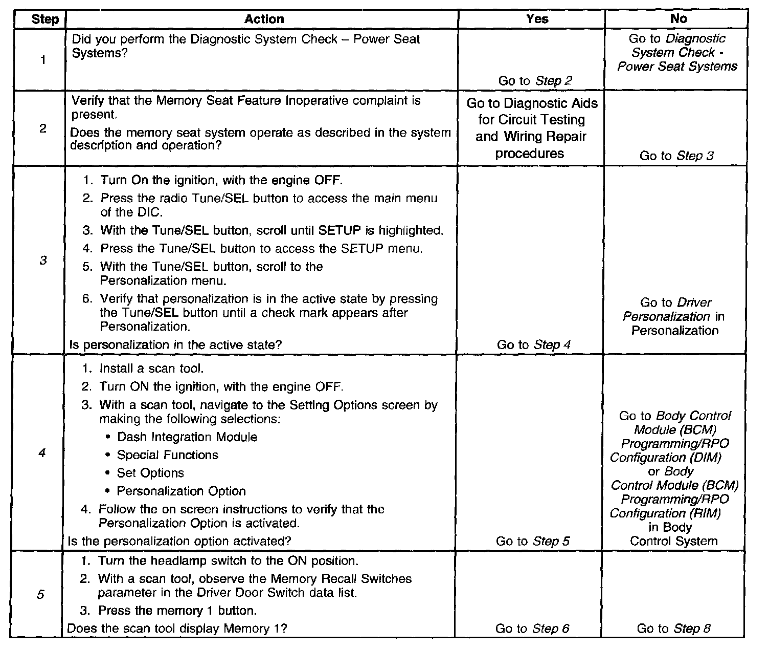 MEMORY SEAT FEATURE INOPERATIVETEST DESCRIPTION