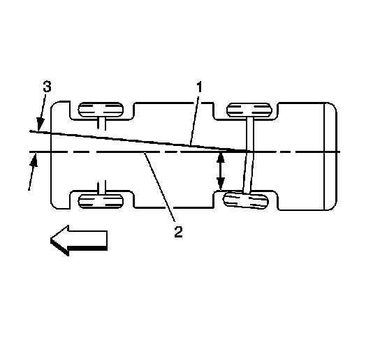 In the illustration, toe-in is shown on the left rear wheel, moving the thrust line (1) off center. The resulting deviation from the centerline is the thrust angle.