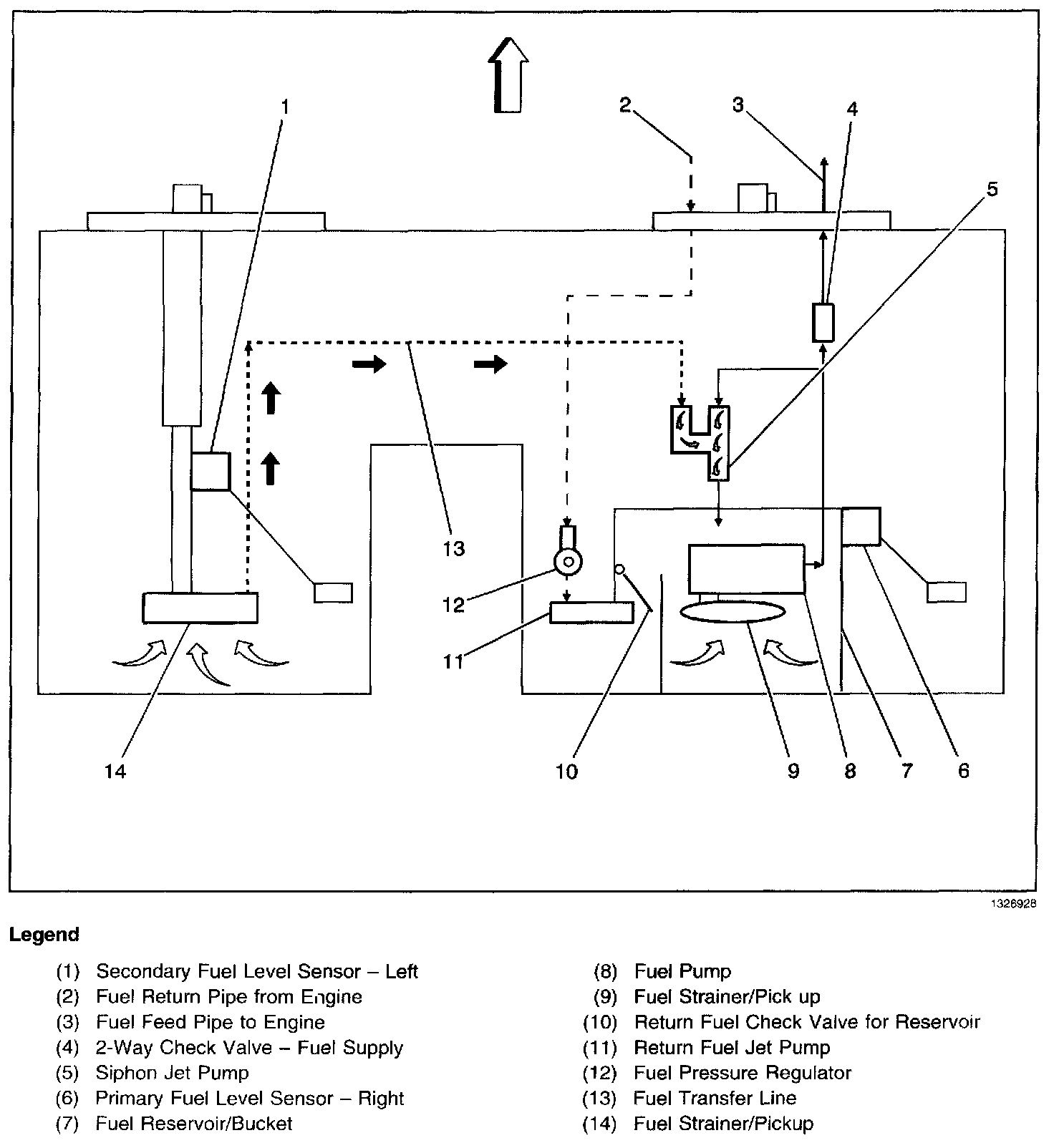 The modular fuel sender assembly maintains an optimum fuel level in the reservoir (bucket). The fuel entering the reservoir is drawn in by the following components: