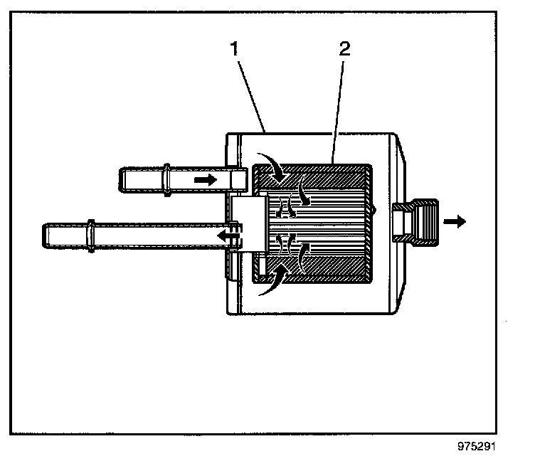 The fuel filter is located on the fuel feed pipe, between the fuel pump and the fuel rail. The electric fuel pump supplies fuel through the in-line fuel filter to the fuel injection system. The fuel pressure regulator keeps the fuel available to the fuel injectors at a regulated pressure. Unused fuel is returned from the fuel filter to the fuel tank by a separate fuel return pipe. The paper filter element (2) traps particles in the fuel that may damage the fuel injection system. The filter housing (1) is made to withstand maximum fuel system pressure, exposure to fuel additives, and changes in temperature. There is no service interval for fuel filter replacement. Replace a restricted fuel filter.