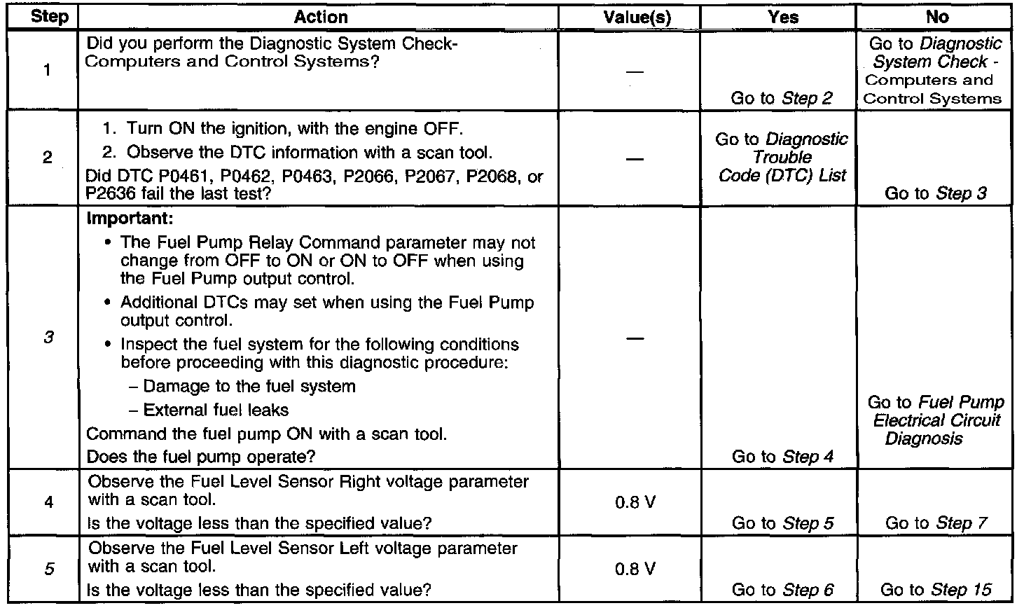 5. This step verifies that the vehicle is not out of fuel. If the right fuel sender is below 0.8 volt, and the left fuel sender is above 0.8 volt, a fuel transfer condition exists.