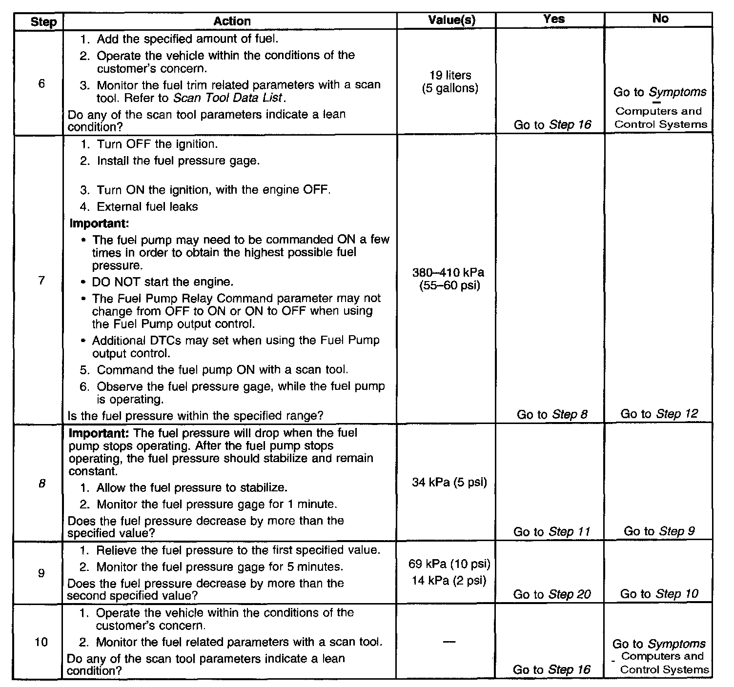 8. This step tests for an internal fuel leak. If the fuel pressure drops during this test, then an internal loss of pressure is indicated.