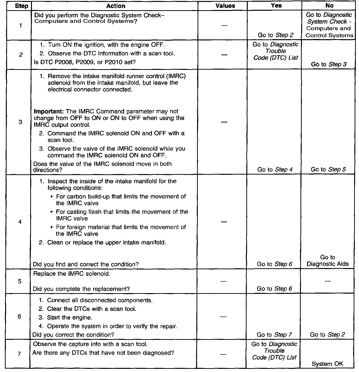 2. This diagnostic table will only diagnose the mechanical portion of the IMRC solenoid. If there is a DTC set for the IMRC solenoid, refer to the appropriate DTC table.