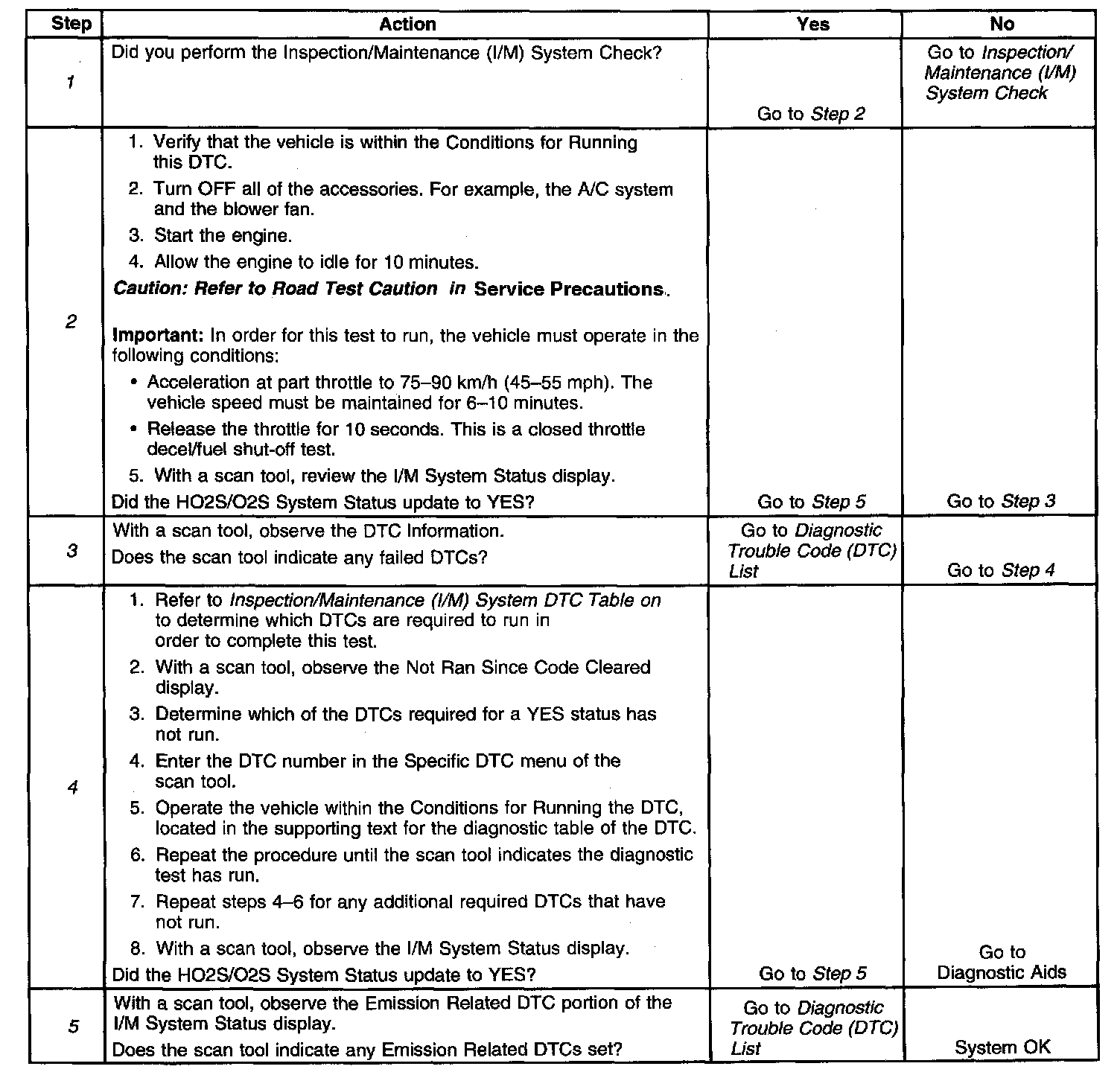 5. The I/M System Status only reports on whether or not a diagnostic has run, not what the outcome of the test was. If any Emission Related DTC sets after the tests are complete, the DTC will require diagnosis.