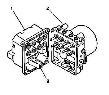 3. Make sure that the internal pump motor connector (3) is installed into the new EBCM (1) prior to EBCM replacement.