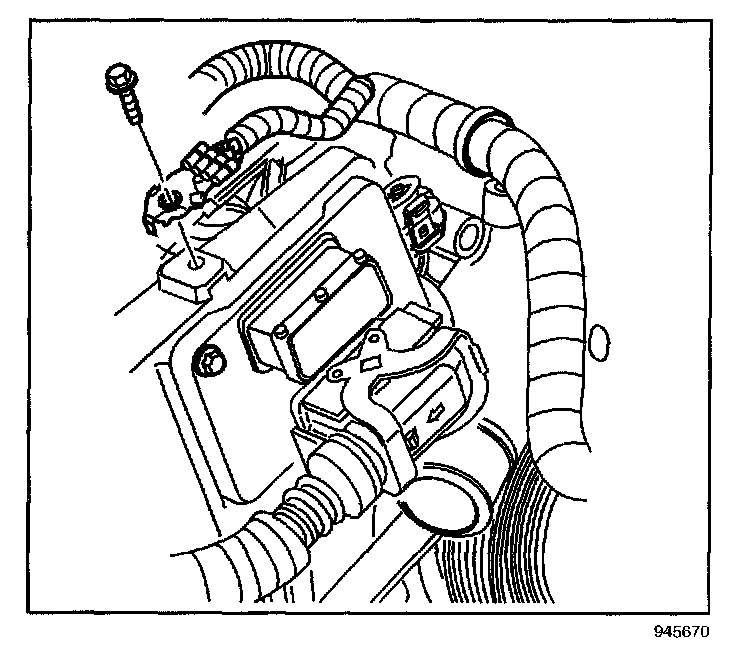 16. Remove the wire harness retainer and bolt from the side of the ECM bracket.