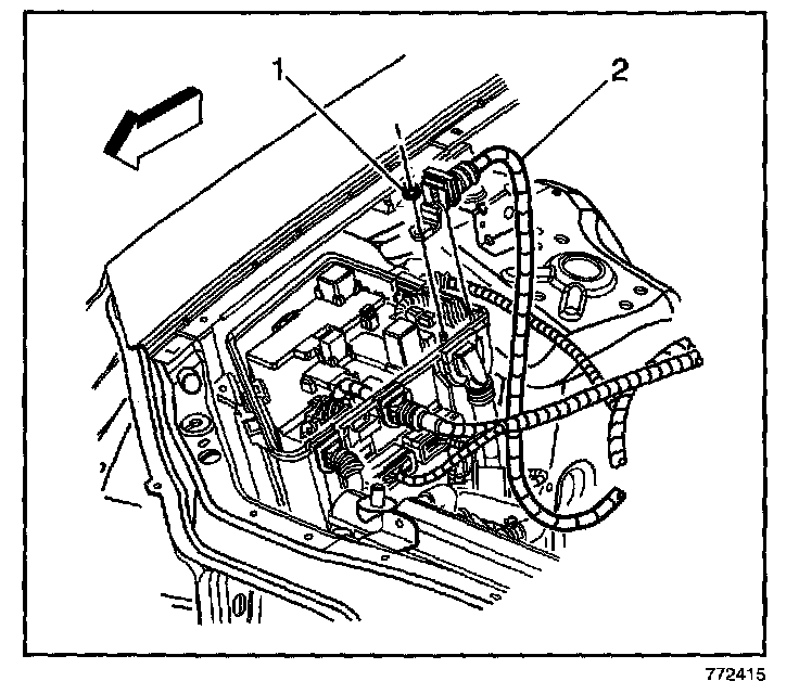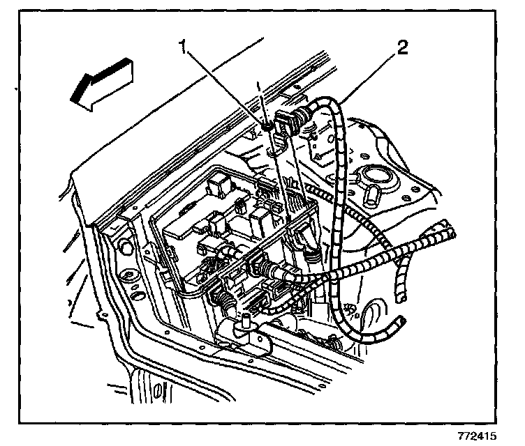 4. Remove the nut (1) securing the battery positive cable (2) to the electrical center.