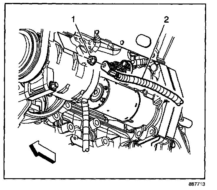 7. Remove the starter terminal nut (1) and disconnect the battery positive cable (2) from the starter.