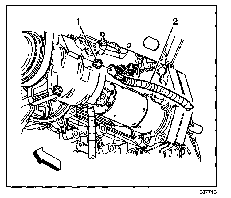 4. Remove the starter terminal nut (1) and the battery positive cable (2) from the starter.