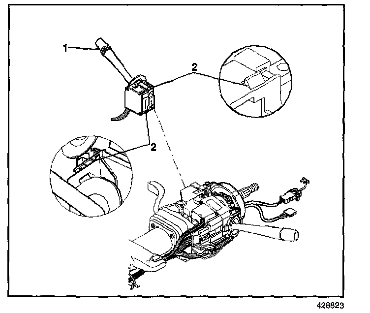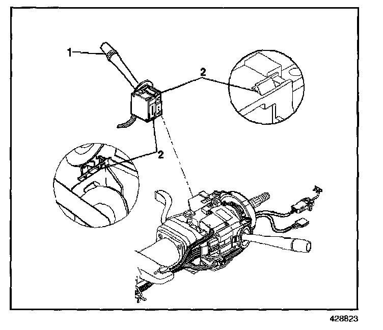 5. Depress the locking tab (2) on the windshield wiper and washer switch (1) and remove the switch from the steering column.
