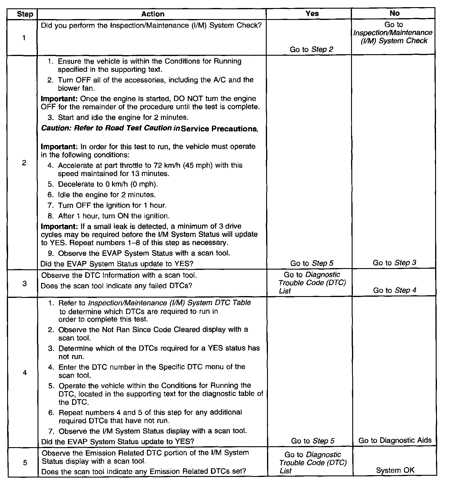 The purpose of this test is to satisfy the enable criteria necessary to execute the inspection/maintenance (I/M) readiness diagnostics for the Evaporative Emission (EVAP) System. The test may be used in order to set the I/M System Status indicators to YES. The I/M System Status Display on the scan tool provides an indication of when the control module has completed the required tests. The I/M System Status does not indicate that the tests have passed or failed. When all of the diagnostics for a specific system have run and passed the I/M System Status will update to YES. If a test for a specific system has failed, the I/M System Status will update to YES indicating a determination was made, even if all of the other tests for that system have not run. If a small leak is detected, a minimum of 3 drive cycles may be required before the I/M System Status will update to YES. Performing a visual inspection prior to running the EVAP test may prevent having to repeat the test. A failed or aborted test will require the vehicle to cool down in order to meet the enable criteria to run another test.