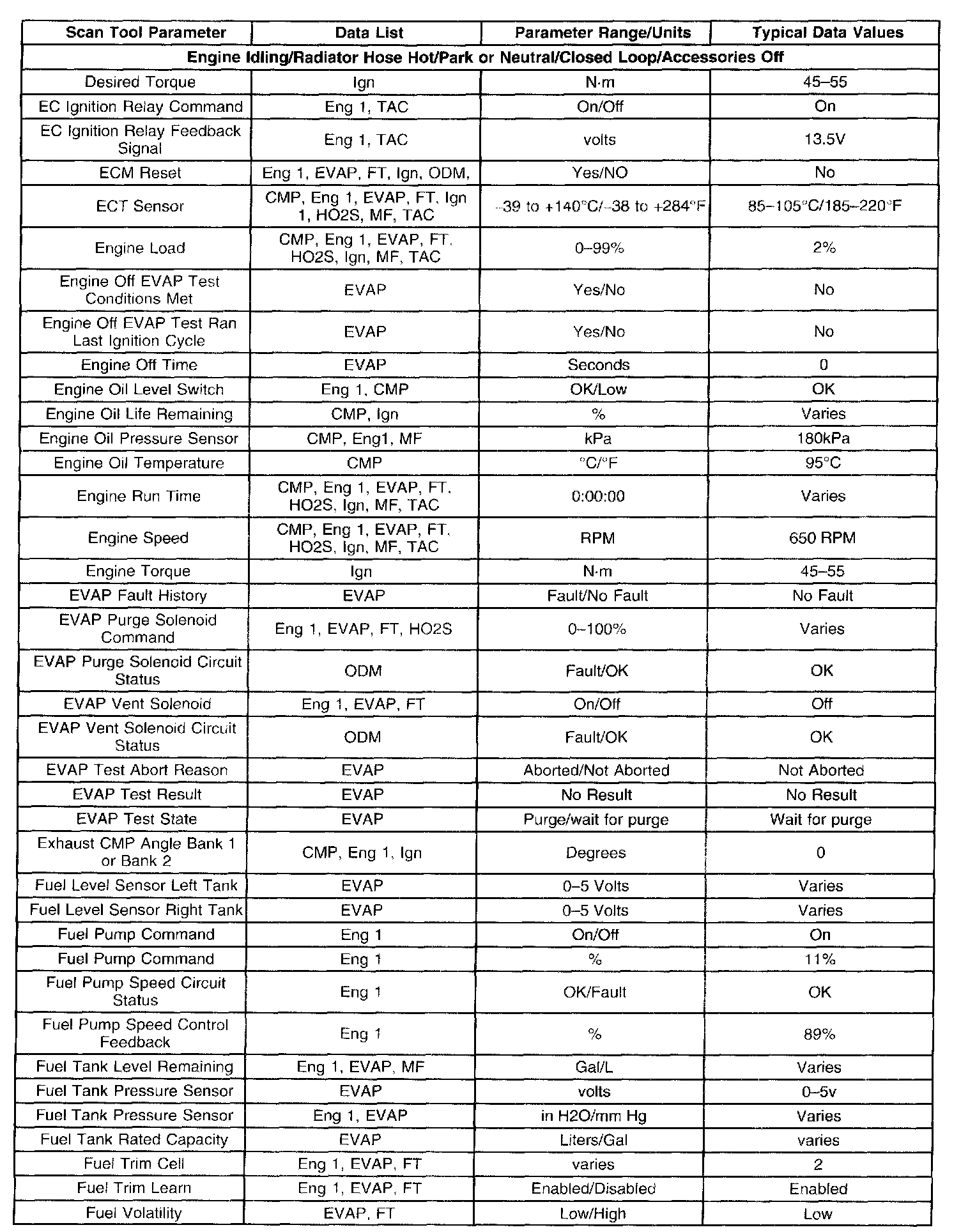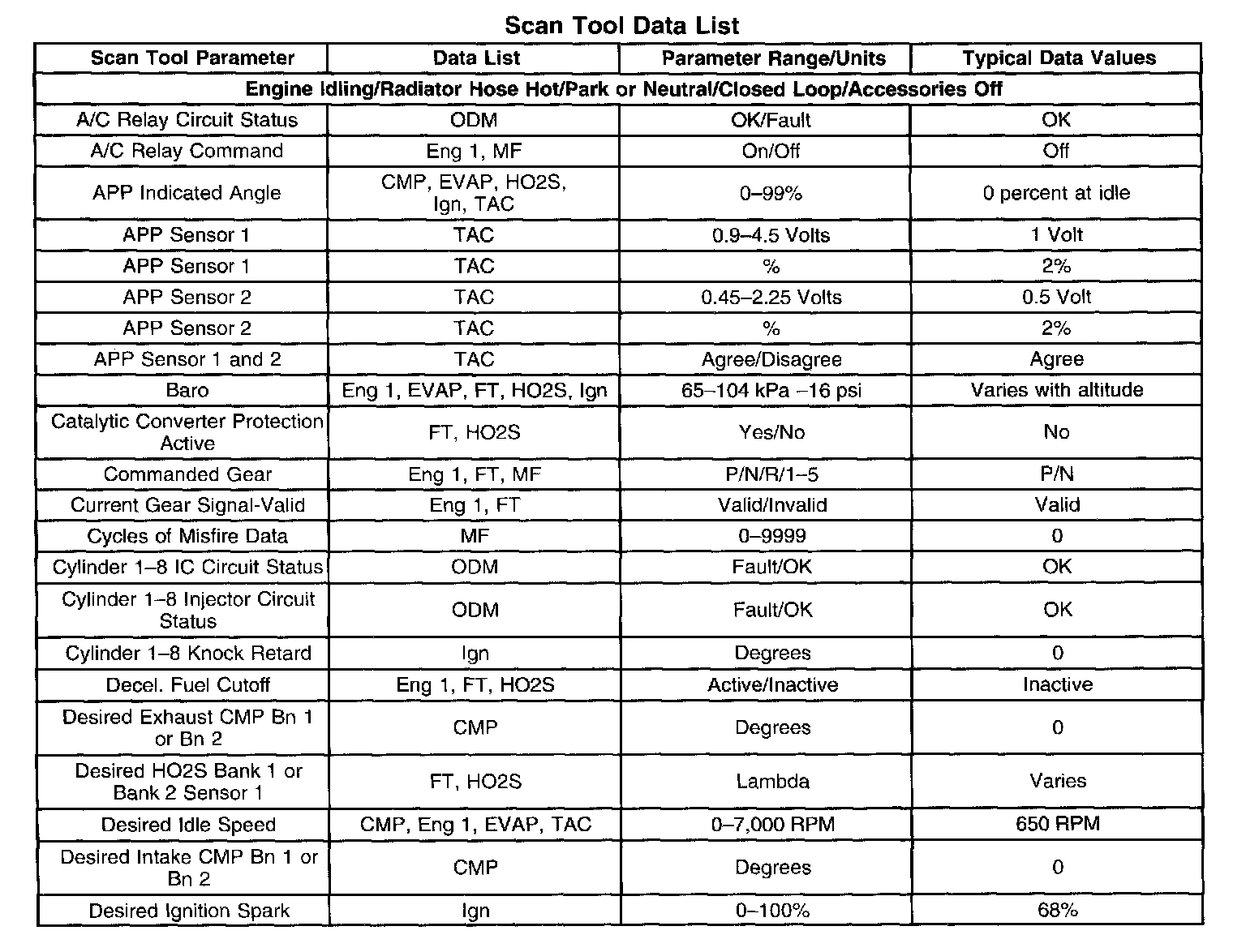 The Engine Scan Tool Data List contains all engine related parameters that are available on the scan tool. The list is arranged in alphabetical order. A parameter may appear in any one of the data lists and in some cases may appear more than once, or in more than one data list in order to group certain related parameters together.