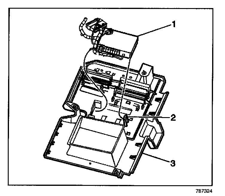 4. Push in on the top of the VCIM (1) until an audible click is heard, indicating the retaining tab (2) has securely fastened the VCIM (1) to the electrical component mounting bracket (3).