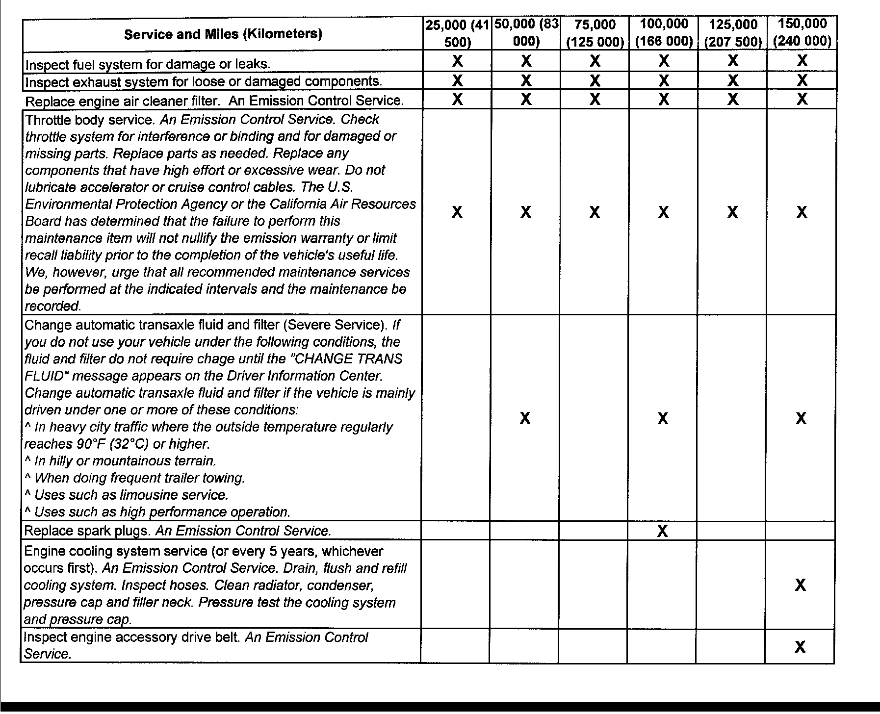 (Maintenance I or Maintenance II) after the indicated kilometers (miles) shown for each item.