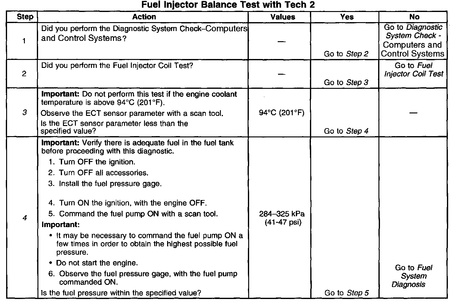 4. The fuel pressure should be within the specified range. Refer to Fuel System Diagnosis if the fuel pressure is not within the specified range. Component Tests and General Diagnostics