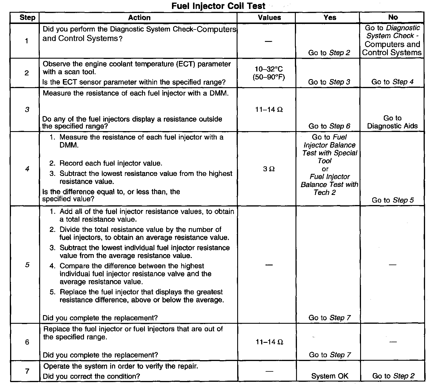 - If the fuel injector coil test does not isolate the condition perform the fuel injector balance test. Refer to Fuel Injector Balance Test with Special Tool or Fuel Injector Balance Test with Tech 2. Component Tests and General Diagnostics Component Tests and General Diagnostics