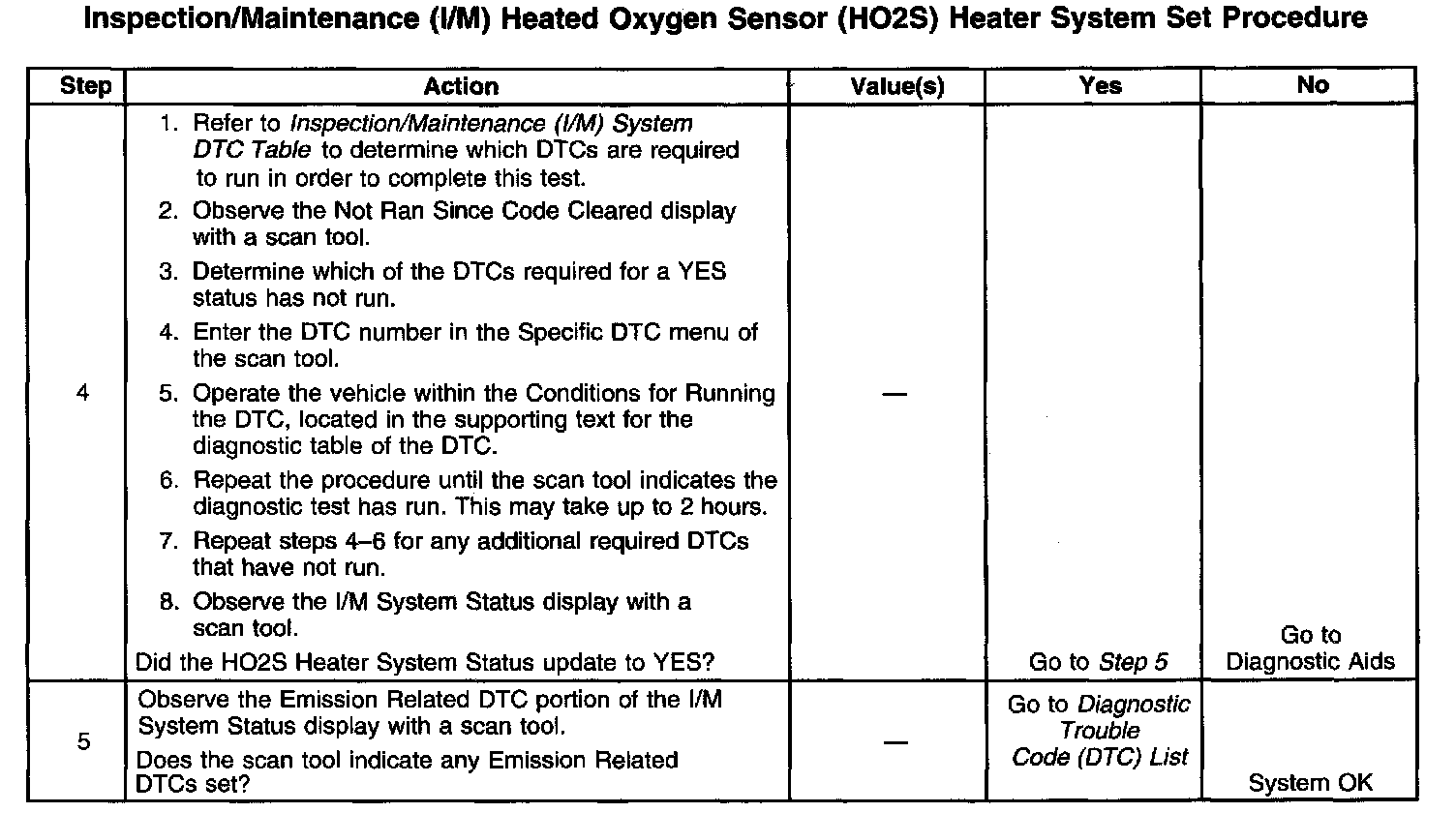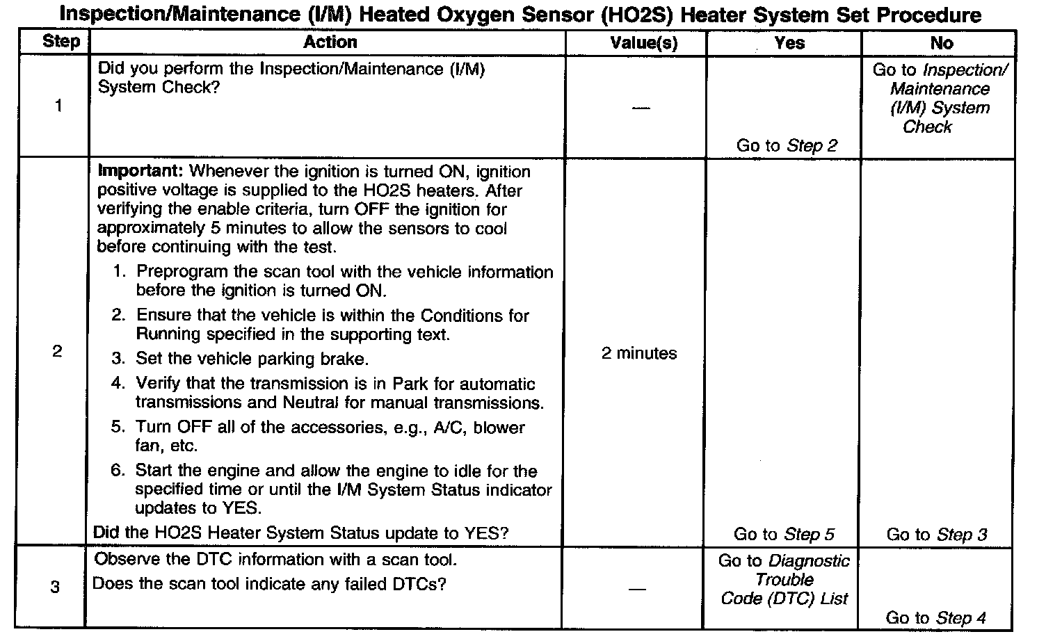 The purpose of this test is to satisfy the enable criteria necessary to execute inspection/maintenance (I/M) readiness diagnostics for the heated oxygen sensor (HO2S) system. The test may be used to set the I/M System Status to YES. The I/M System Status display on the scan tool provides an indication of whether the control module has completed the required tests. The I/M System Status does not indicate that the tests have passed or failed. When all of the diagnostics for a specific system have run and passed, the I/M System Status will update to YES. If a test for a specific system has failed, the I/M System Status will update to YES, indicating a determination was made, even if all of the other tests for that system have not run.