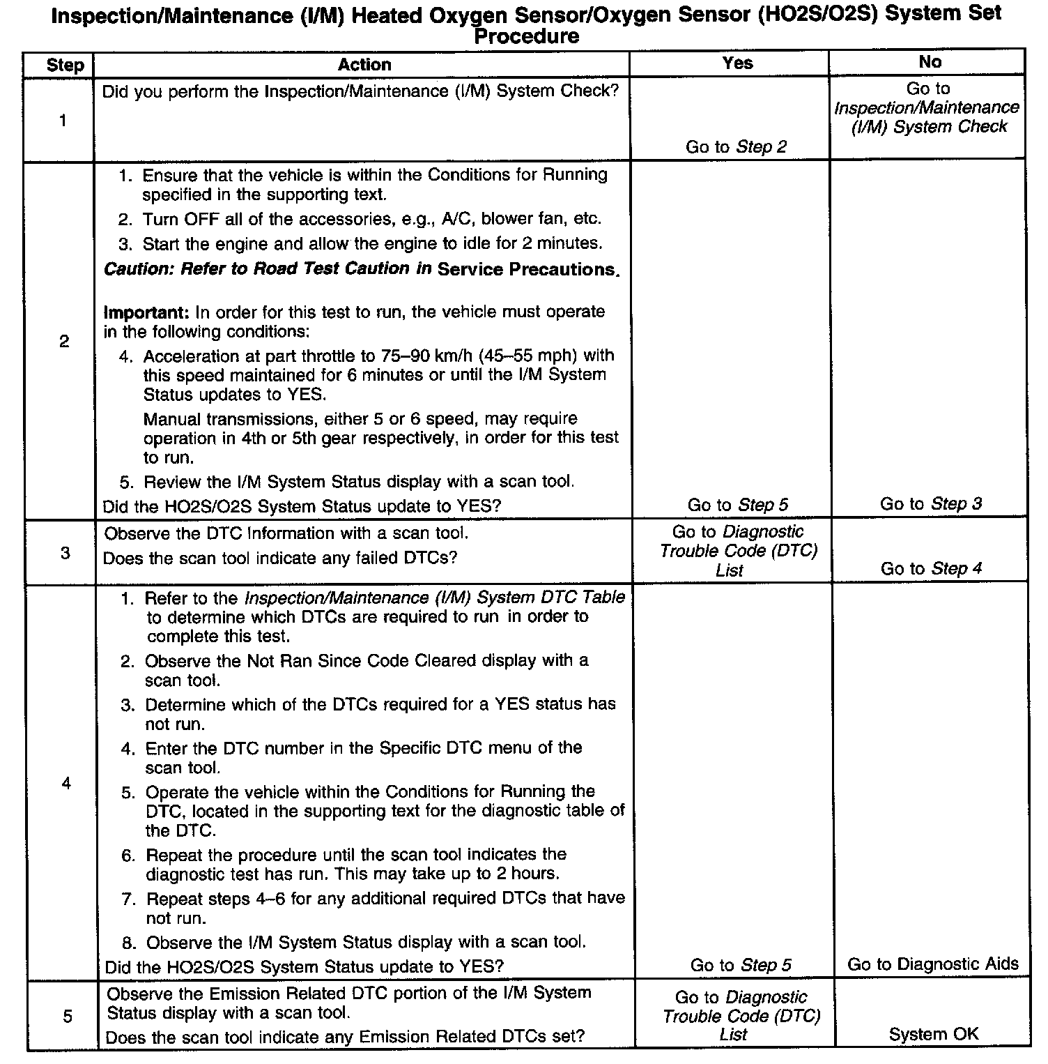 The purpose of this test is to satisfy the enable criteria necessary to execute I/M readiness diagnostics for the oxygen sensor (O2S, HO2S) system. The test may be used to set the I/M System Status to YES. The I/M System Status display on the scan tool provides an indication of whether the control module has completed the required tests. The I/M System Status does not indicate that the tests have passed or tailed. When all of the diagnostics for a specific system have run and passed, the I/M System Status will update to YES. If a test for a specific system has failed, the I/M System Status will update to YES, indicating a determination was made, even if all of the other tests for that system have not run.