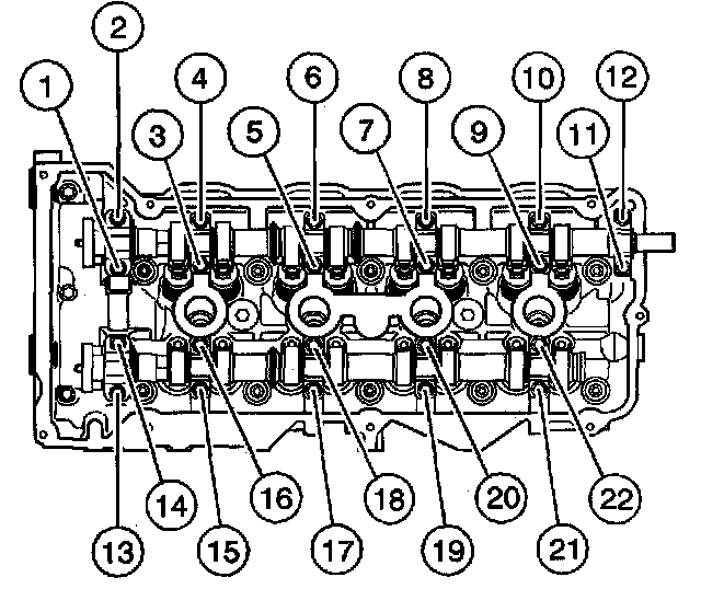 Tighten the camshaft bearing cap bolts 5 Nm (44 inch lbs.)