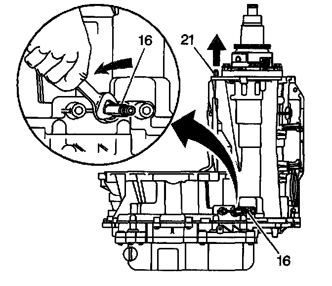 2. Rotate the manual shaft (16) counterclockwise in order to place the transmission in park and prevent the differential from rotating.