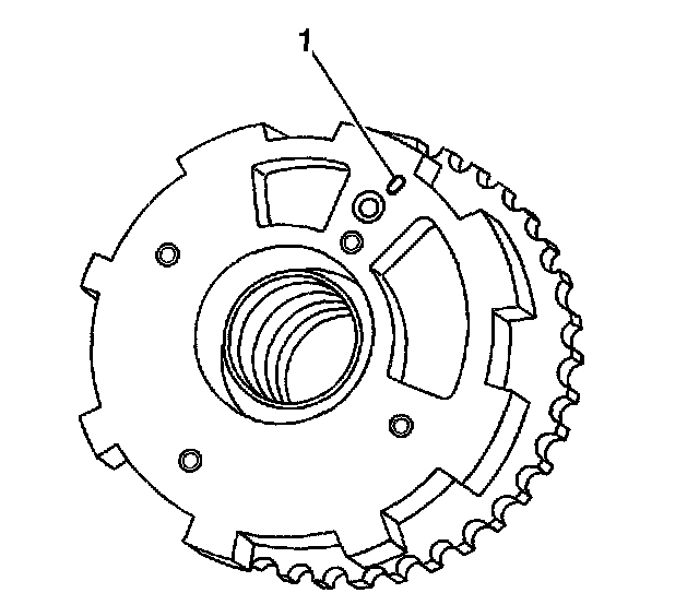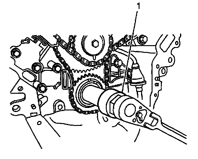 15. Align the timing mark of the Bank 1 (right) exhaust camshaft position actuator to the black link (1) on the secondary timing chain and assemble the actuator on the exhaust camshaft as shown.