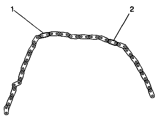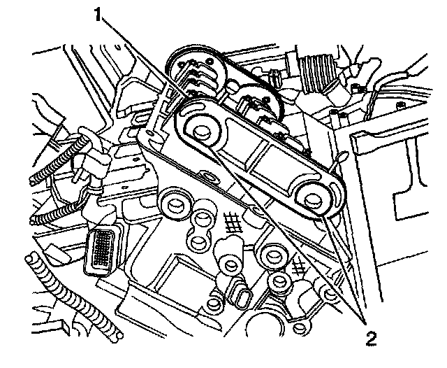9. Assemble the left exhaust camshaft position actuator with its timing mark aligned with the black link (2) in the secondary timing chain as shown.