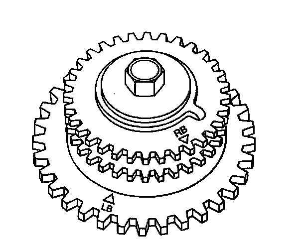 12. The intermediate timing gear outer most sprocket timing mark is labeled with the letters right bank (RB). The triangle point is timed to a black link on the right secondary timing chain.