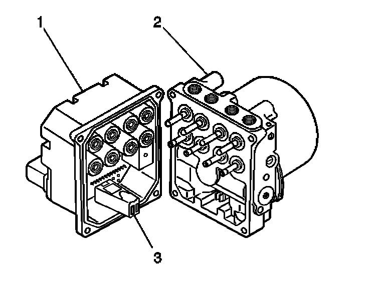 9. Depress the lock tab and release the cam (2) to disconnect the electrical connector from the EBCM (3).