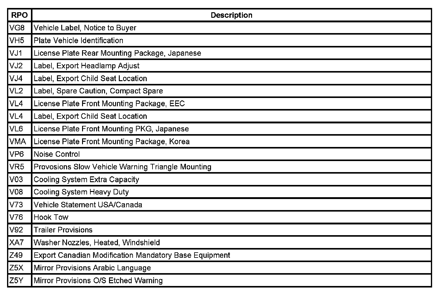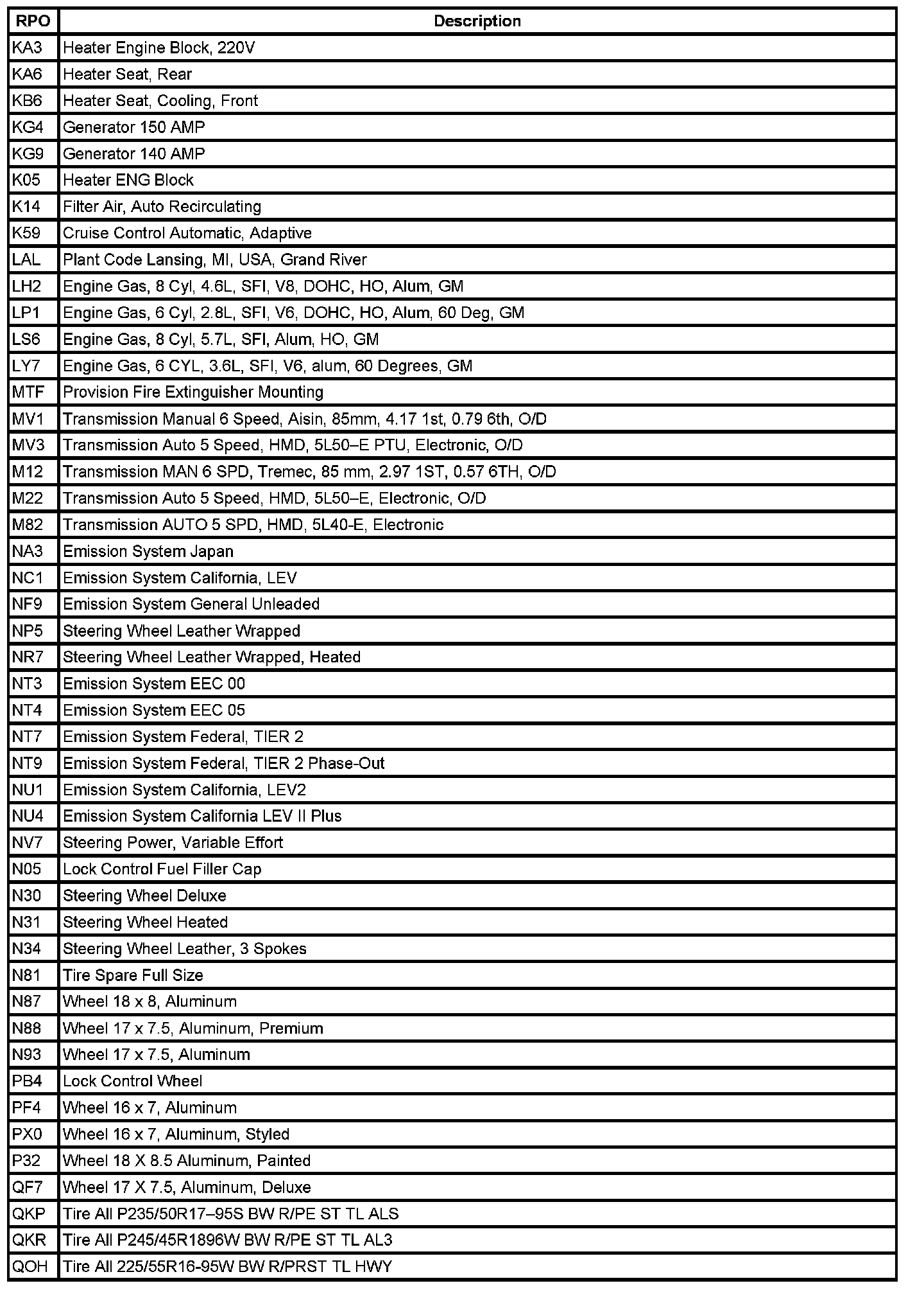 The table provides the description of the Regular Production Option (RPO) codes that are available on the vehicle. The vehicle's RPO list is printed on the Service Parts Identification Label.