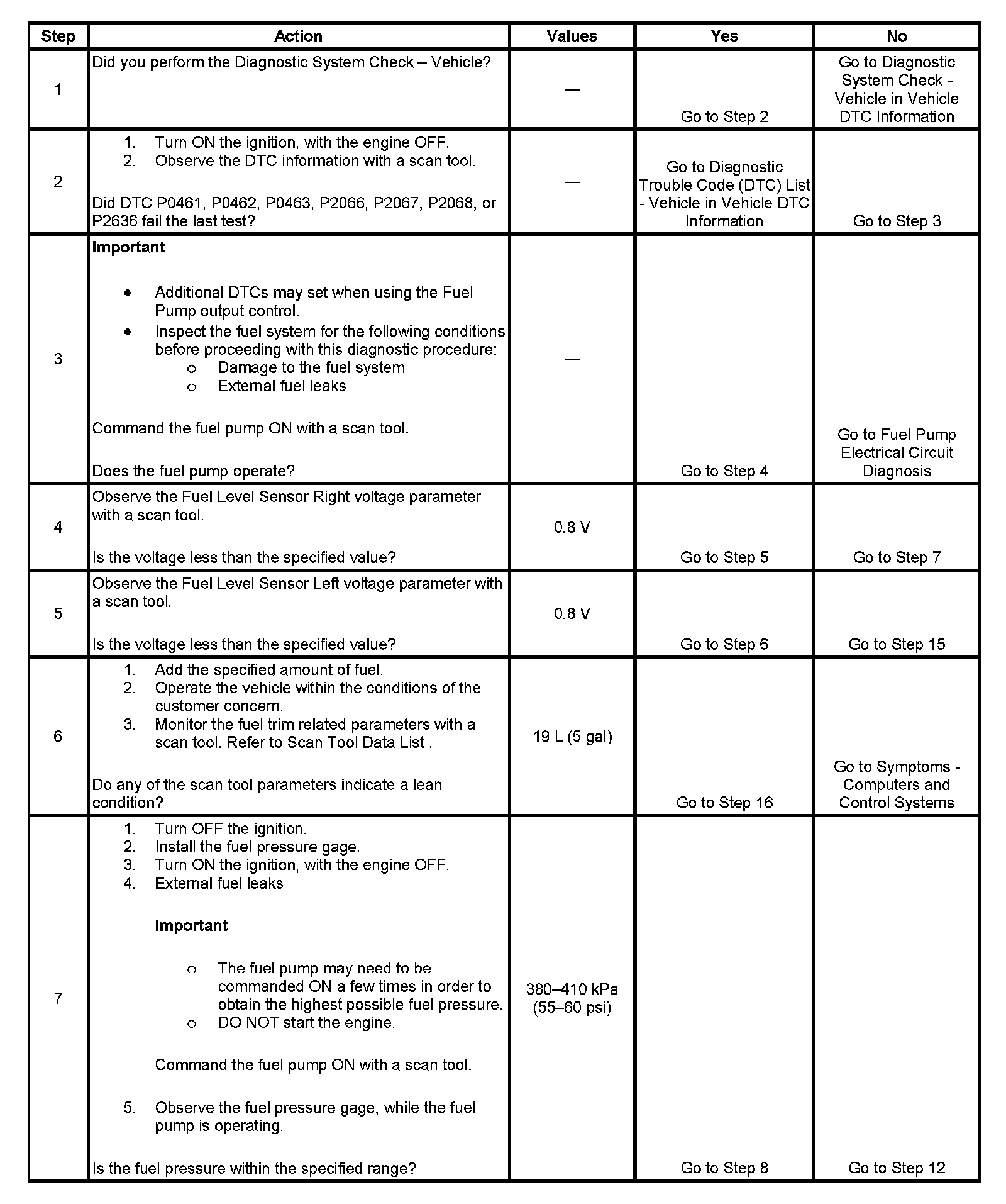 5. This step verifies that the vehicle is not out of fuel. If the right fuel sender is below 0.8 volts, and the left fuel sender is above 0.8 volts, a fuel transfer condition exists.
