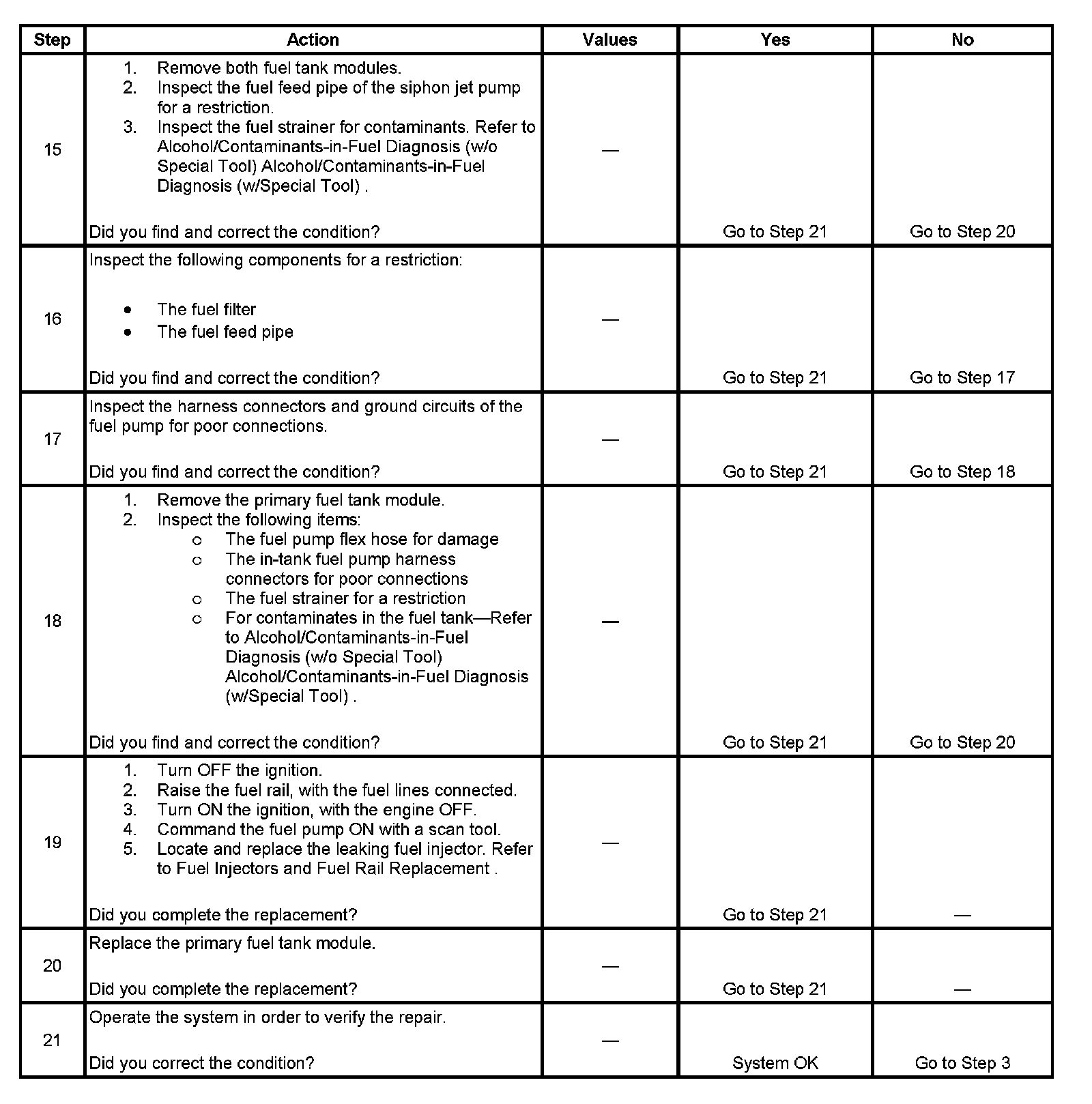 17. This step verifies that a circuit condition is not the cause of a fuel pressure concern. Inspect all fuel pump electrical circuits thoroughly.