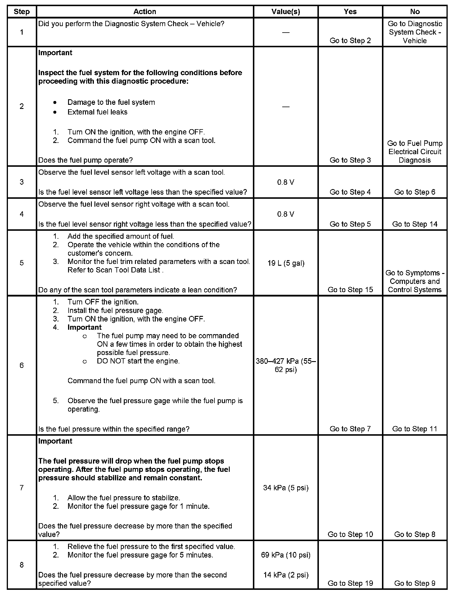 7. This step tests for an internal fuel leak. If the fuel pressure drops during this test, then an internal loss of pressure is indicated.