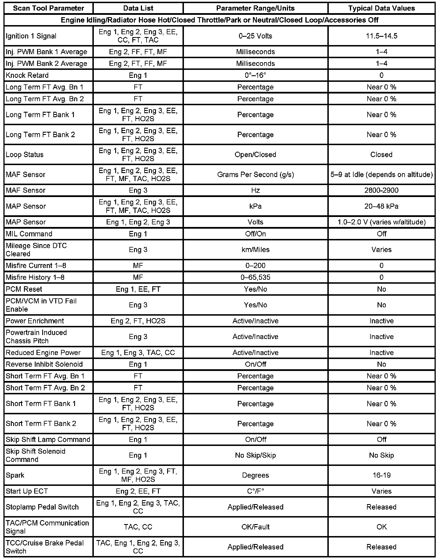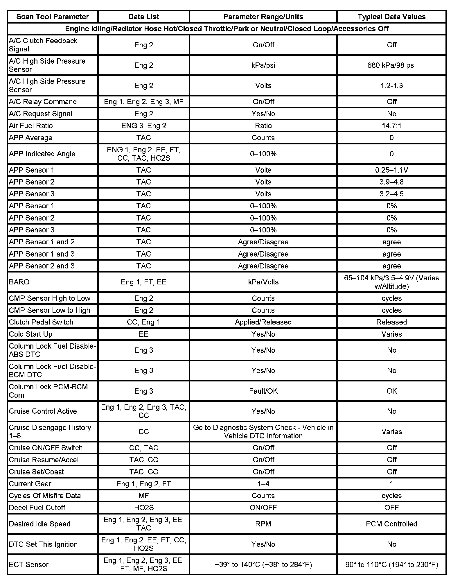 Scan tool values from a properly running engine may be used for comparison with the engine you are diagnosing. The Engine Scan Tool Data List represents the values that would be seen on a normal running engine.