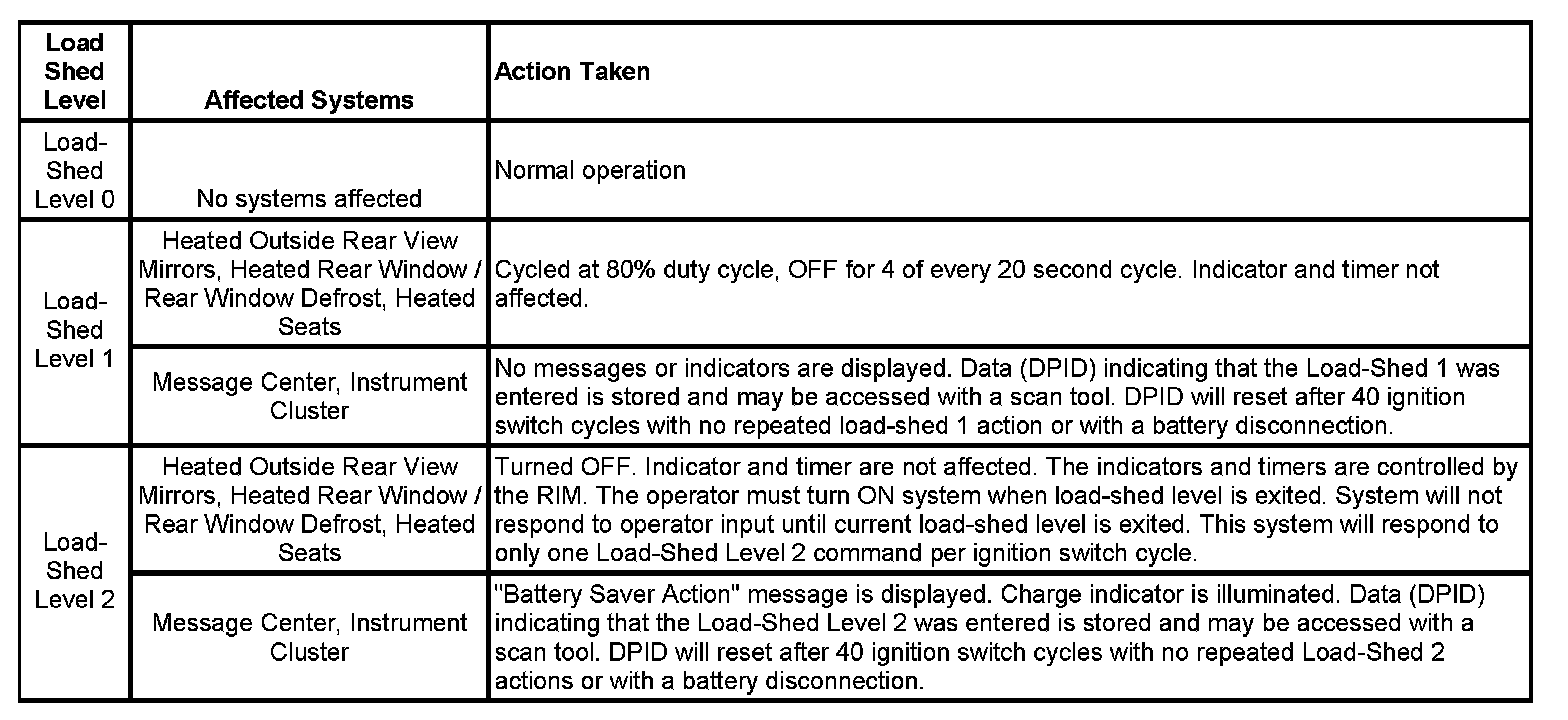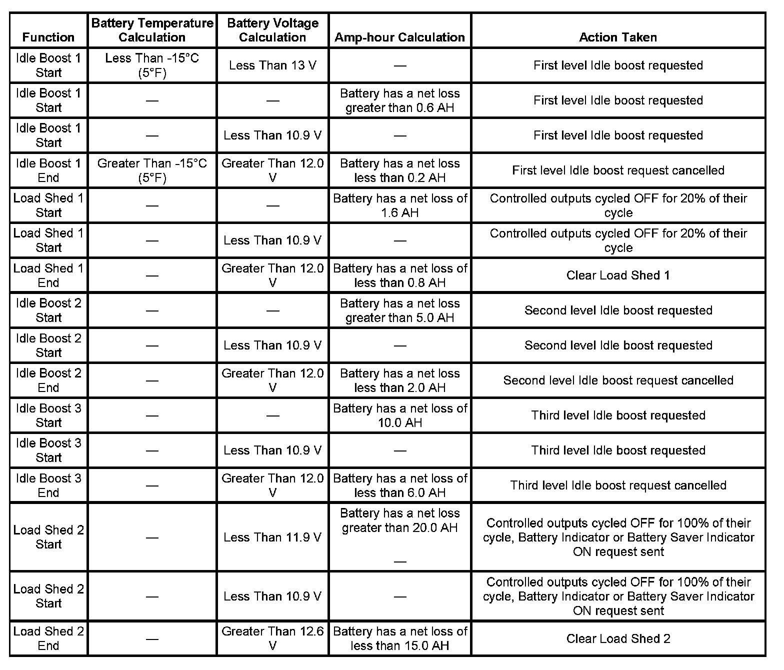 When the EPM algorithm is running, the DIM calculates the net charge rate on the electrical system by making constant voltage measurements. It uses the measurements to calculate the charge rate in amp/hours. If the DIM detects a negative charge rate, equal to a discharge from the battery, EPM can request up to 3 levels of idle boost from the ECM, when the vehicle is in park or neutral, as well as up to 2 levels of load shedding for a total of 5 levels of corrective action to maintain proper vehicle electrical system operation.
