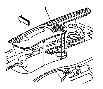 1. Using a flat bladed tool, pry upward on the rear edge of the defroster grille (1) in order to release defroster grille (1) retaining clips from the IP upper trim pad.
