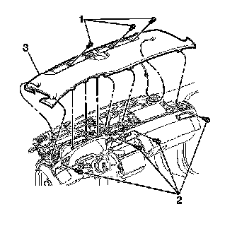 5. Remove the three fasteners (1) from the inside of the defroster grille outlet holes to the upper pad (3).