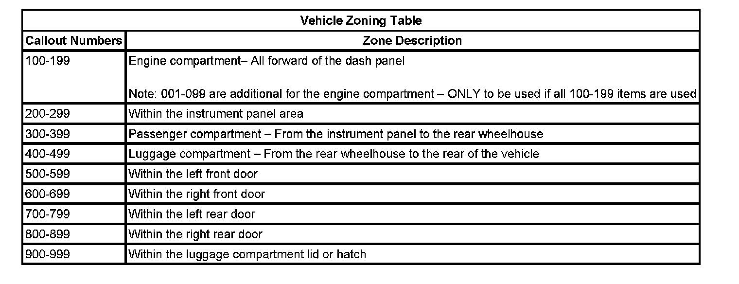 All grounds, in-line connectors, pass-through grommets, and splices have identifying numbers that correspond to where they are located in the vehicle. The table explains the numbering system.