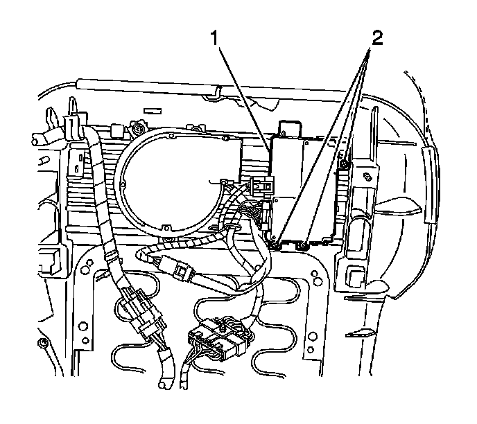 2. Install the fasteners (2) that retain the climate control seat module (1) to the passenger storage tray.