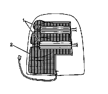 1. Fold back the centers (1) of the factory heat element material. Insert the service heat element (2), with the backing paper side up, between the trim cover material and the factory heat element material.