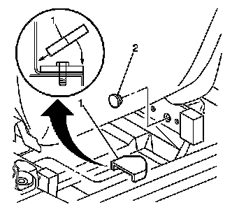 9. Remove the trim cover (1) and remove the anchor fastener access plug (2) from the rear of the seat track.