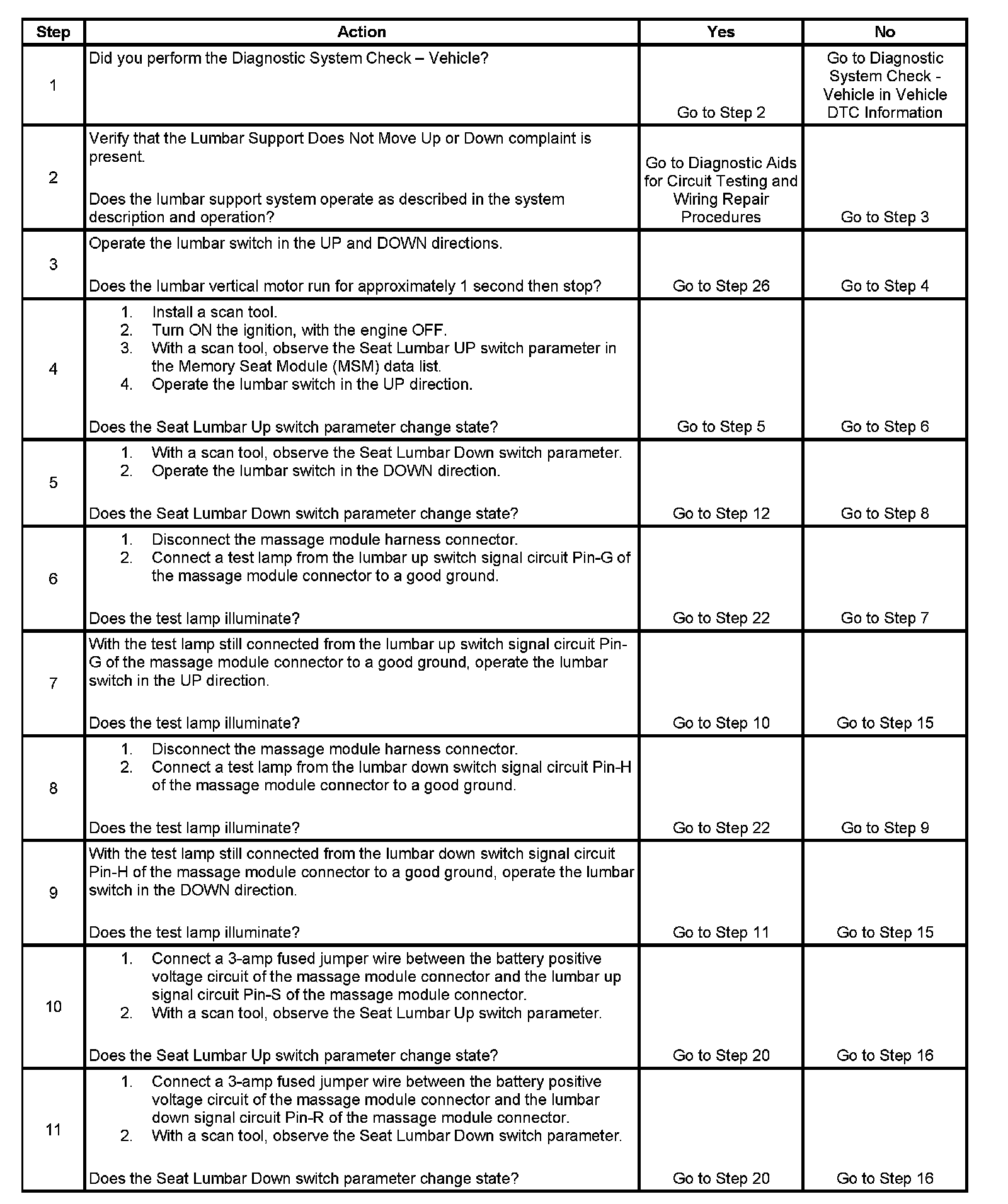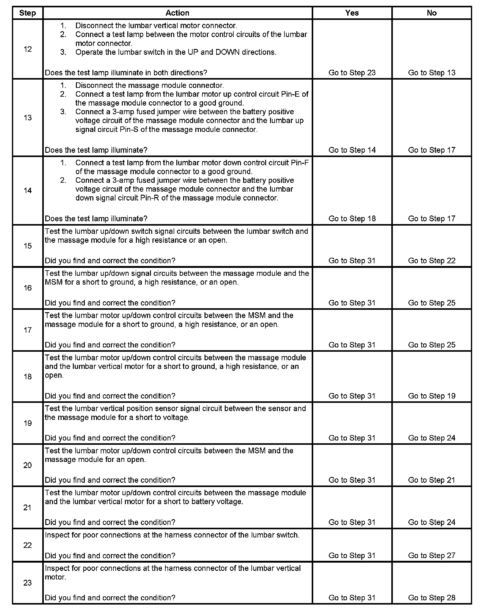13. This step verifies that the massage module is receiving lumbar up motor control voltage from the MSM.