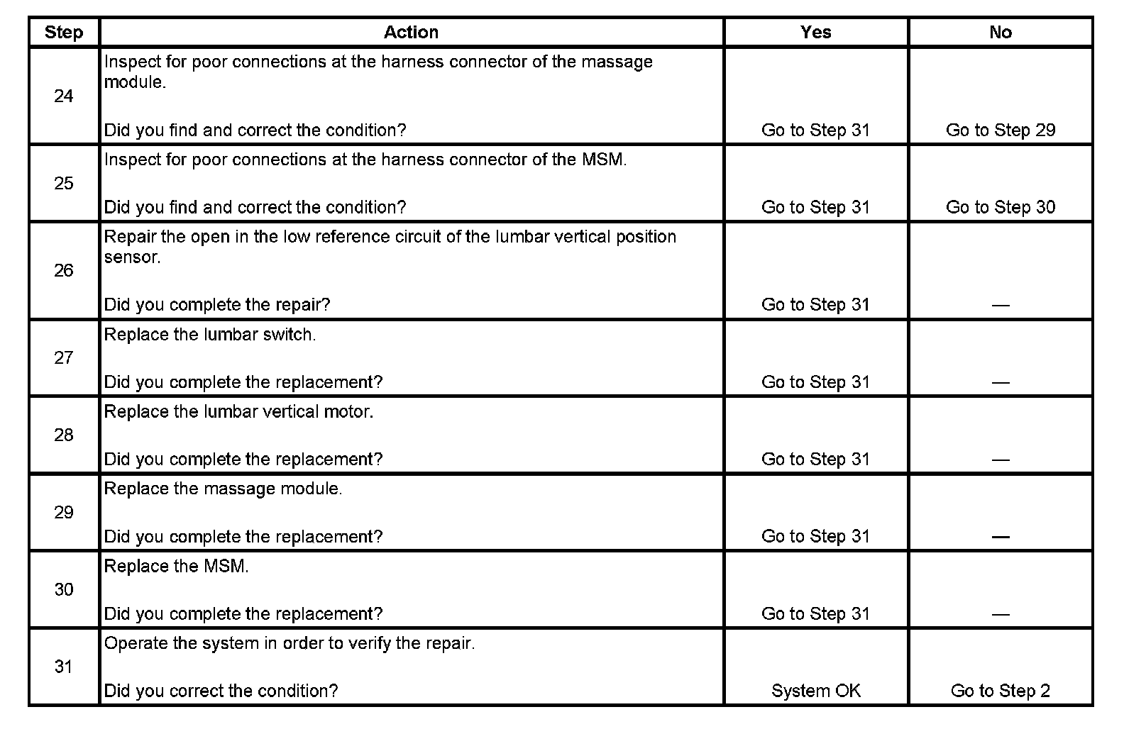 14. This step verifies that the massage module is receiving lumbar down motor control voltage from the MSM.