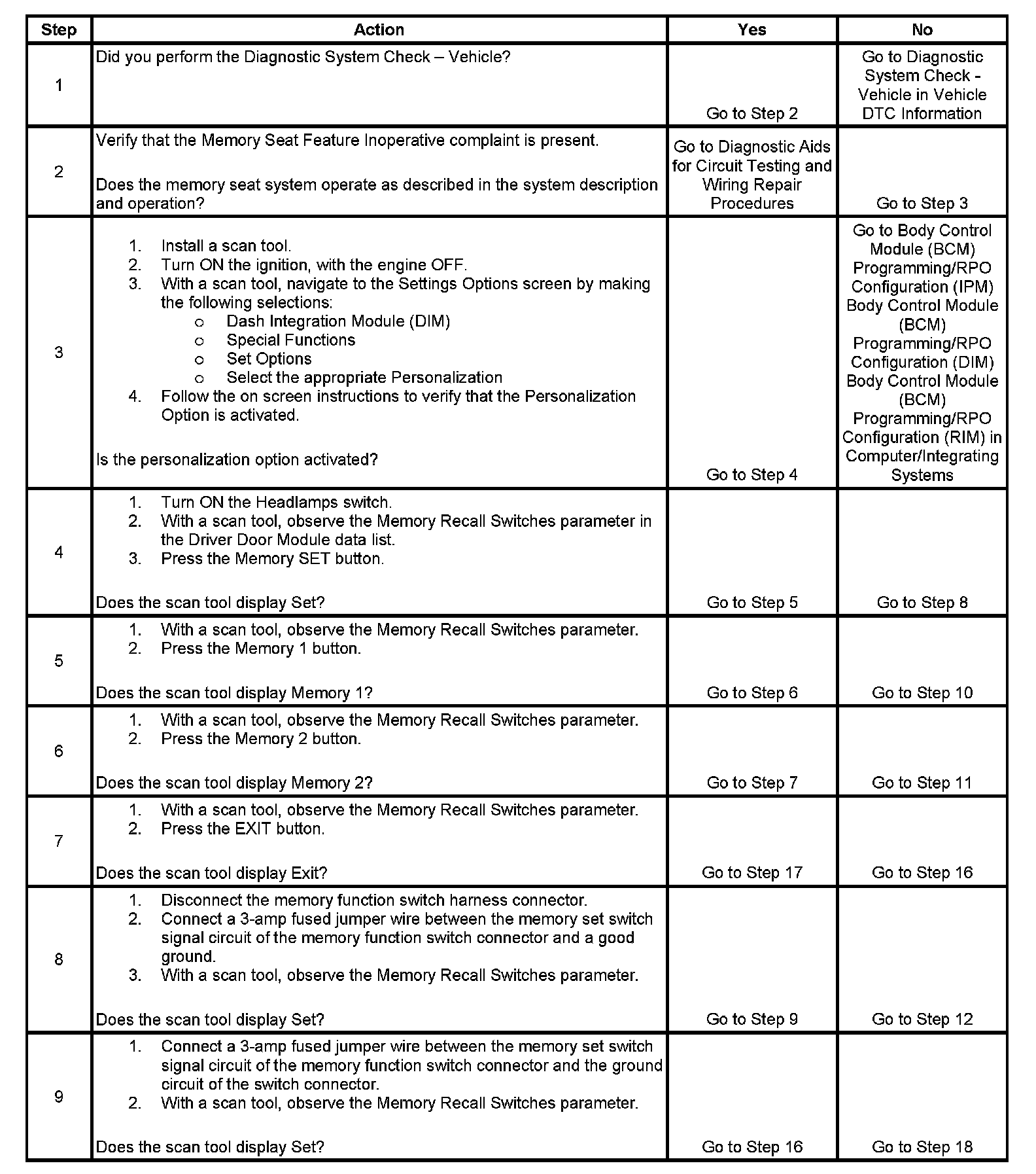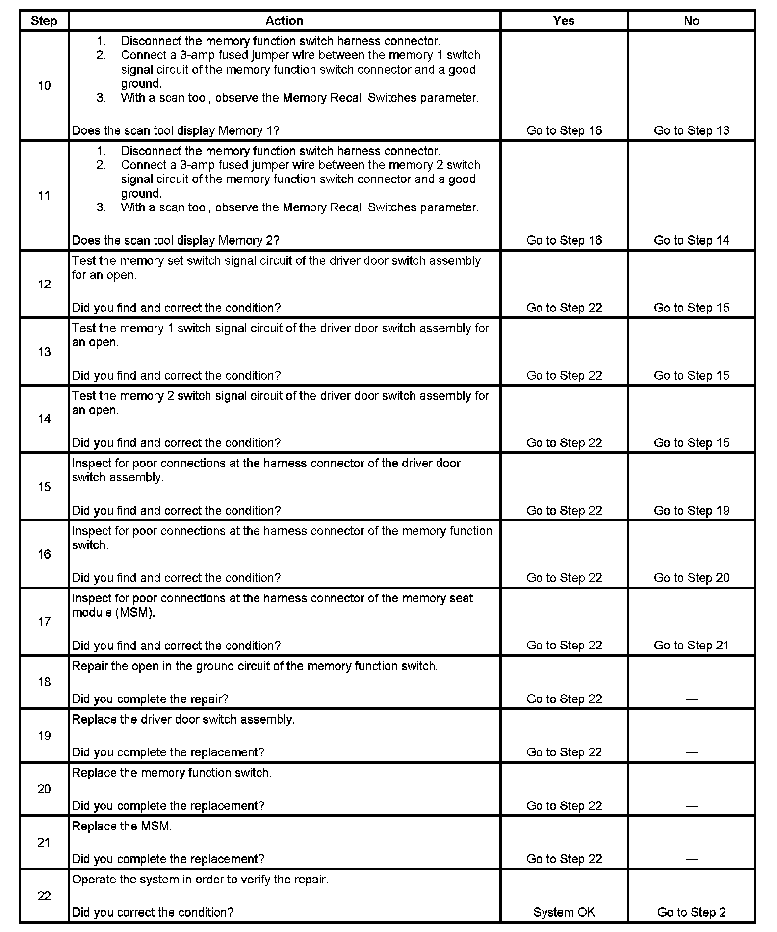 10. This step tests the integrity of the memory 1 switch signal circuit of the driver door switch assembly. If the fuse in the jumper wire opens when you perform this test, a short to battery voltage may have occurred.