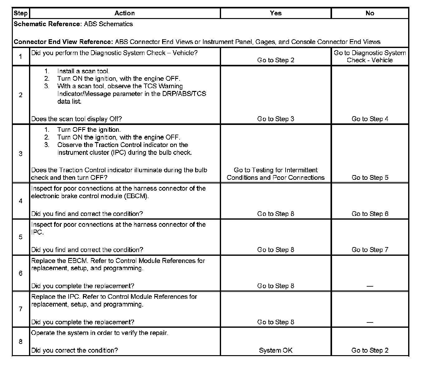 The Traction Control indicator is controlled by the instrument cluster (IPC) via serial data messages from the electronic brake control module (EBCM). The EBCM send a serial data message to the IPC to illuminate the Traction Control indicator when the EBCM has disabled TCS due to a DTC. The Traction Control indicator will also turn ON during the instrument cluster bulb check. When the ignition switch is turned to ON, the Traction Control indicator will turn ON for approximately 3 seconds and then turn OFF.