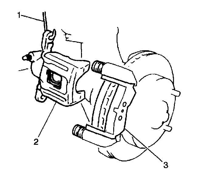 1. Remove the brake caliper from the mounting bracket and support the brake caliper (2) with heavy mechanic's wire (1), or equivalent; do NOT disconnect the hydraulic brake flexible hose from the caliper.