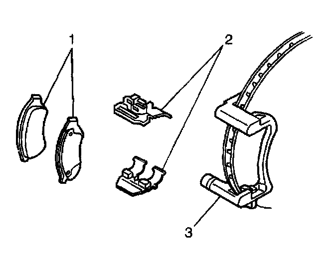3. Remove the brake pad retainers (2) from the brake caliper bracket (3).
