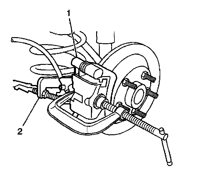 13. Remove the park brake cable bracket (2) from the brake caliper (1).