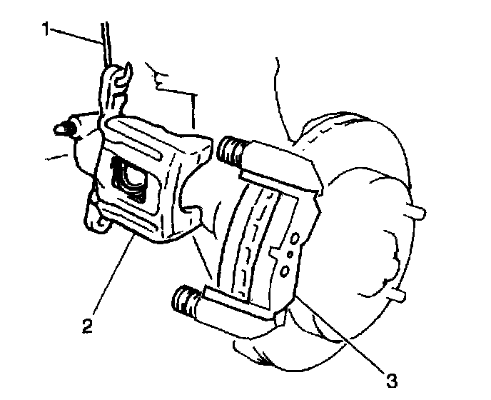 1. Remove the brake caliper from the mounting bracket and support the brake caliper (2) with heavy mechanic's wire id), or equivalent. Discard the old caliper pin bolts, new bolts are supplied in the hardware kit. It is not necessary to disconnect the hydraulic brake flexible hose from the caliper.