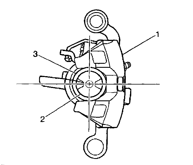 4. Retract the brake caliper piston (2) into the brake caliper bore. Use a spanner type wrench to turn the piston (2) clockwise until it bottoms in the brake caliper bore and align the piston.